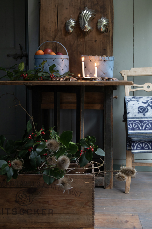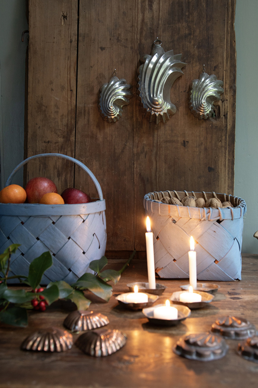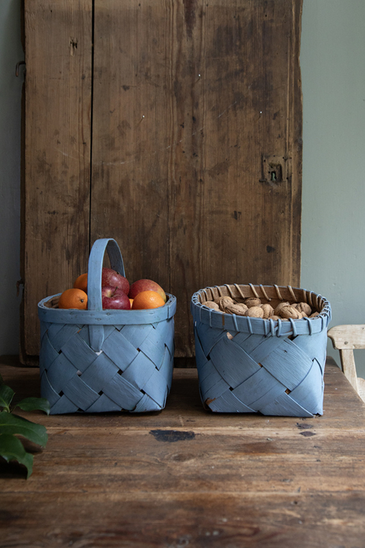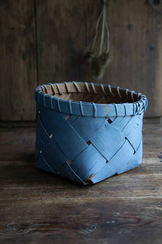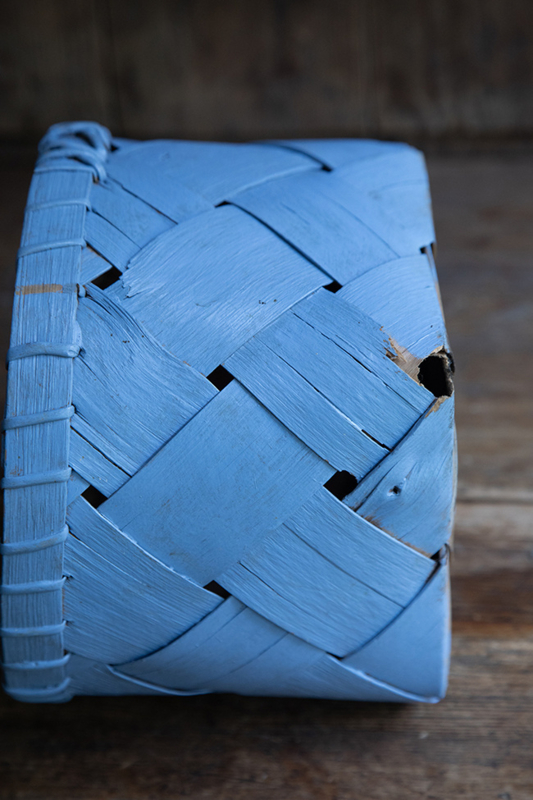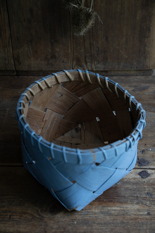 OverzichtMooie antieke spaandermand met mooi afgewerkte rand, in blauw. Afkomstig uit Dalarna in midden Zweden.
